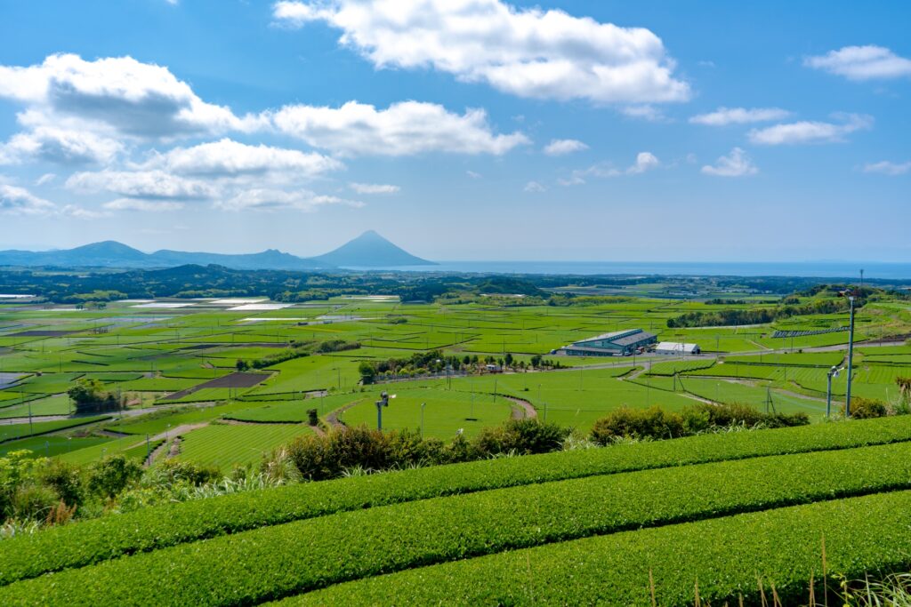 薩摩半島の南端に広がるこの地を訪れると、まずそのスケール感に圧倒されます。なだらかな丘陵地帯に見渡す限り広がる茶畑。その向こうには、「薩摩富士」と呼ばれる美しい開聞岳(かいもんだけ)がそびえ立ちます。