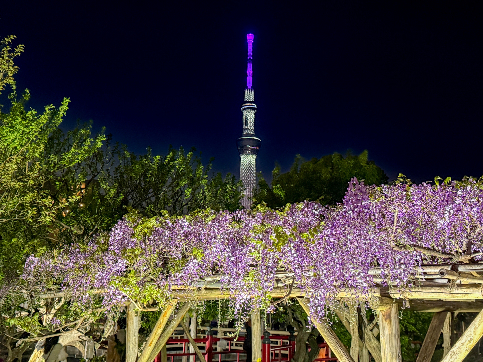 • 藤棚とスカイツリー 4月下旬から5月上旬にかけて、境内の藤棚が一斉に開花します。池に映る紫色の藤と、遠景にそびえる現代の塔・スカイツリーが織りなす景色は、まさに「東京の新旧の名所」が融合した絶景です。