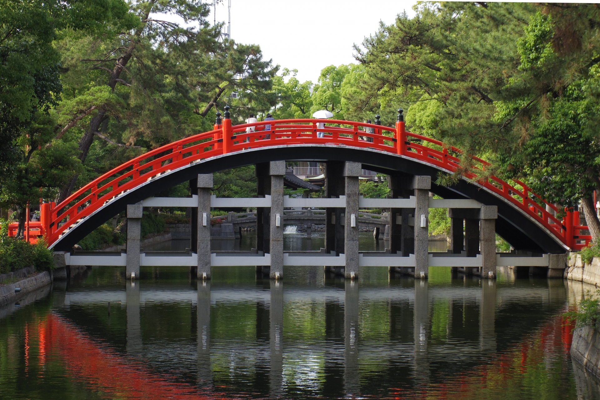4棟ある本殿は「住吉造(すみよしづくり)」と呼ばれる、神社建築史上最も古い様式の一つです。伊勢神宮の「神明造」、出雲大社の「大社造」と並び称されます。特徴は、屋根が反っておらず直線的であること、入口が妻側(建物の短い辺)にあることです。4棟すべてが国宝に指定されており、その荘厳な姿は圧巻です。 - 反橋(そりばし) – 通称:太鼓橋(たいこばし)