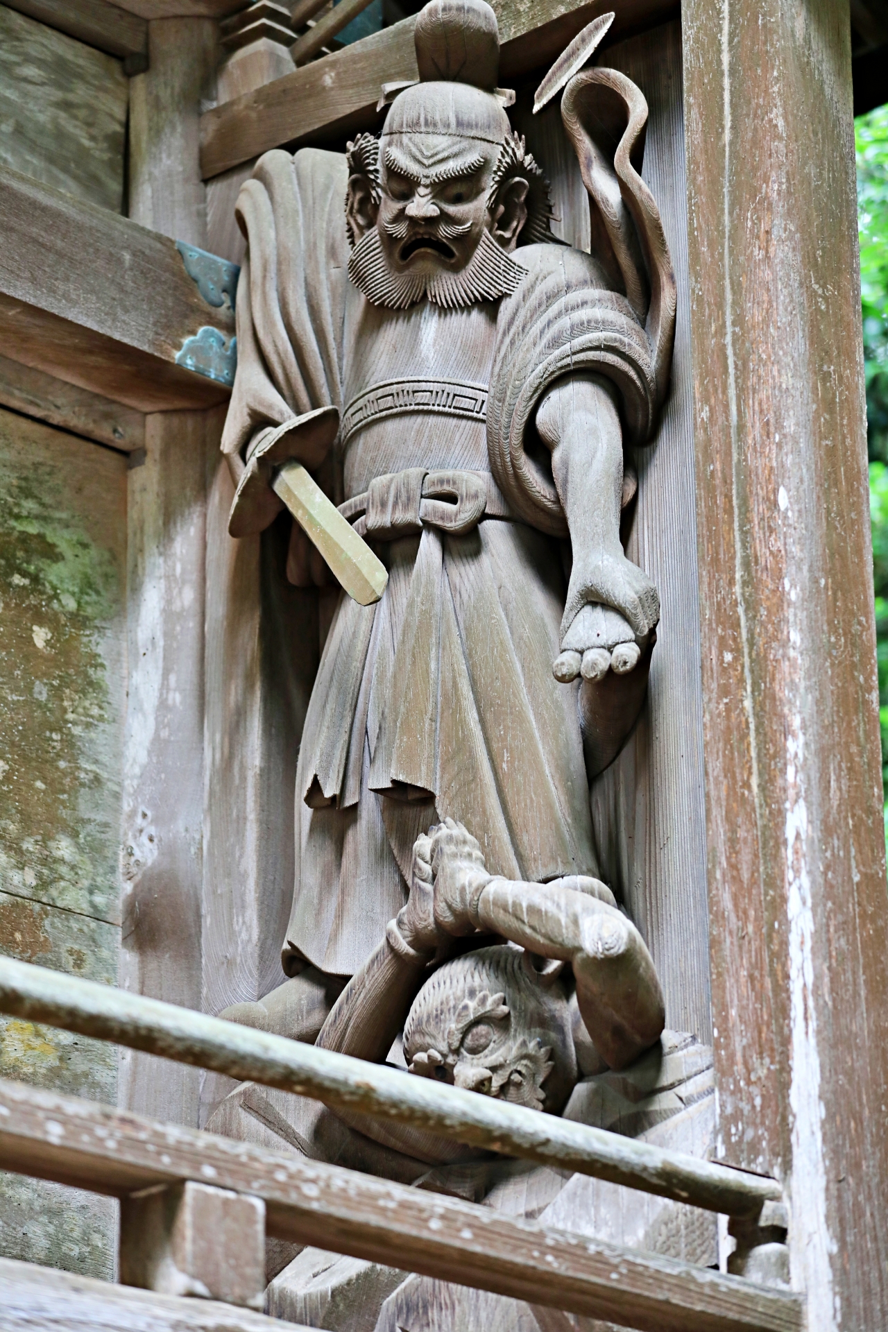 1778年に再建された本殿は、九州南部を代表する神社建築の傑作です。精緻な彫刻が施された「五間社流造(ごけんしゃながれづくり)」という様式で、特に「鬼八伝説」をモチーフにした三毛入野命の彫刻は必見です。 - 夫婦杉(めおとすぎ)