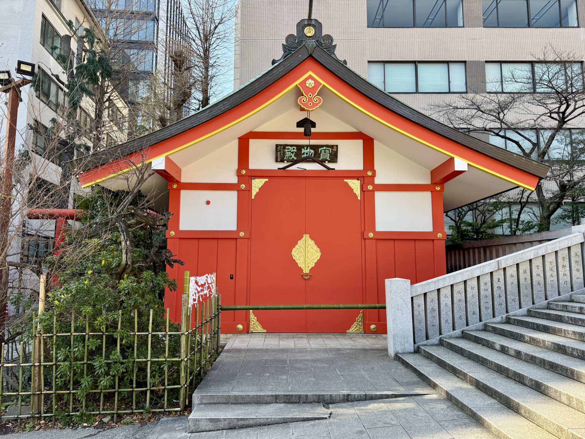 現在の社殿は、戦災で焼失した後、昭和40年(1965年)に再建されたものです。都会的ながらも荘厳な雰囲気を漂わせています。 - 芸能浅間神社(げいのうあさまじんじゃ)