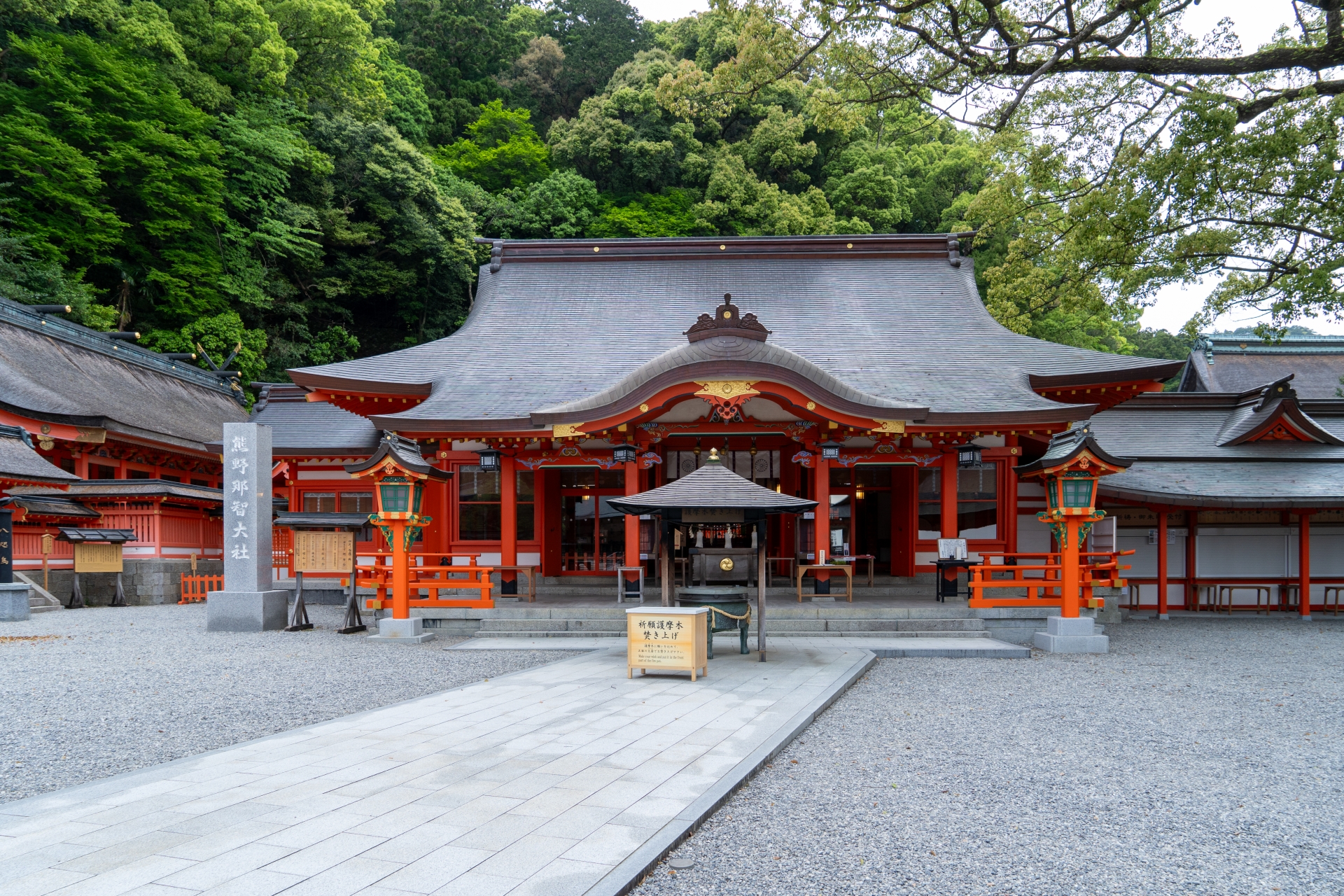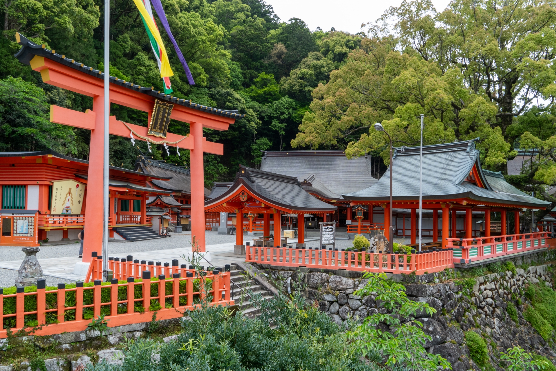 - 標高約330〜500mの山腹に位置し、鮮やかな朱塗りの社殿が並びます。ここからは遠く熊野灘(太平洋)を見渡すことができ、天空の聖地といった趣があります。