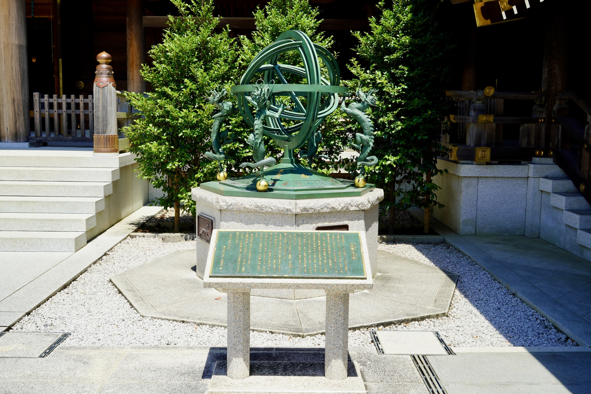 - 渾天儀(こんてんぎ)のレリーフ 本殿の右手にある、天体の位置を測る「渾天儀」のレリーフ。八方除の根源である「星」や「方位」との深い関わりを象徴しており、台座を支える龍の彫刻とともに人気の撮影スポットです。